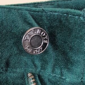 Talbot's Straight Leg Velveteen Pants in Green. These festive pants feature 5-pocket styling, zipper fly with a gunmetal gray Talbot's branded button closure, 2 patch pockets in the back, and 2 slide pockets in the front with a small coin pocket. Super soft and comfortable 98% cotton and 2% spandex. Size 12.