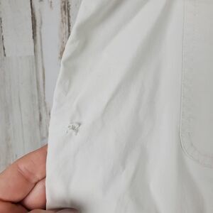 button hook closure, side pockets, back open pockets, cotton spandex blend
