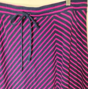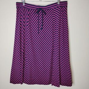 Classic and comfortable Talbots knit skirt in a vibrant pink and navy stripe pattern. Features an easy pull-on waistband with tie detail and a flattering A-line silhouette. Perfect for pairing with sweaters, blouses, or layering with boots this fall.