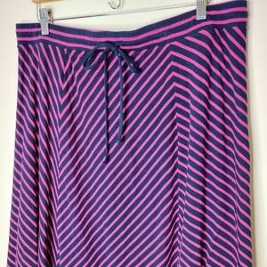Classic and comfortable Talbots knit skirt in a vibrant pink and navy stripe pattern. Features an easy pull-on waistband with tie detail and a flattering A-line silhouette. Perfect for pairing with sweaters, blouses, or layering with boots this fall.