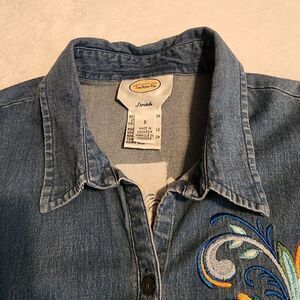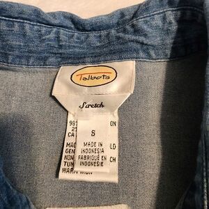 Talbots Stretch womens long sleeve, collared, button front embroidered front and back denim shirt, size small... to has good stretch