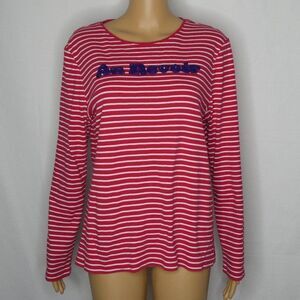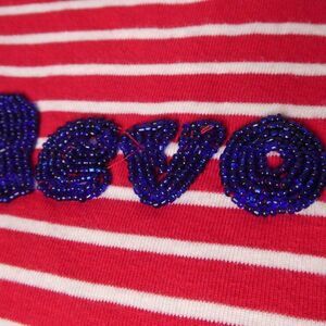 So cute! Red and white striped long sleeve tee with beaded Au Revoir on the front. In excellent condition, I'm tempted to keep this for myself!