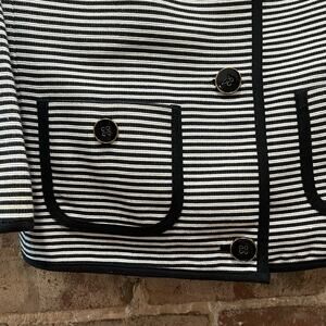 Beautiful jacket in a textured black and white striped pattern. Quality fabric that holds a great shape, perfect for the spring and summer season. A figure flattering fit and wears beautifully open or closed showing its nice black and gold trimmed buttons. Bracelet length sleeves, two front button close pockets. Subtle silver metallic threads throughout.