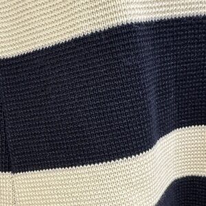 Chic navy blazer with bold cream stripes. Features button closure and zippered pockets. Perfect for a sophisticated style. Fabric feels like a heavy sweater. Measures 26 inches long and 23 inches across the chest, side to side. #925139