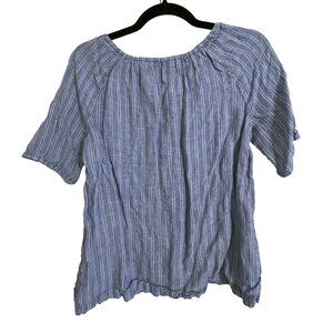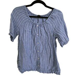 Cute linen blend button-down blouse with an elastic scoop neck.