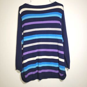 Item: women's long sleeve sweater top, navy purple blue and white stripes, scalloped side hem, size petite xl