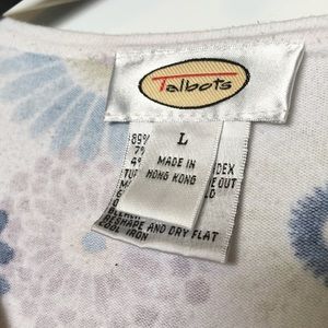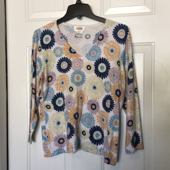 Talbots size L (Large) V-neck lightweight sweater with flower motif in navy, aqua, gold, lime, grey-lavender.