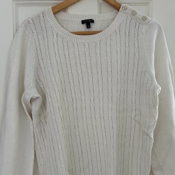 Talbots cable cream colored sweater with cute buttons on left shoulder, 57% cotton/28% acrylic/15% polyester