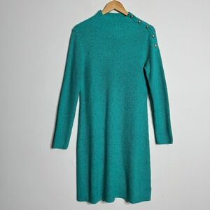 Style Tags: Talbots size small sweater dress ribbed sweater dress greenish blue gold buttons on shoulder