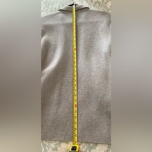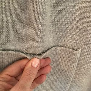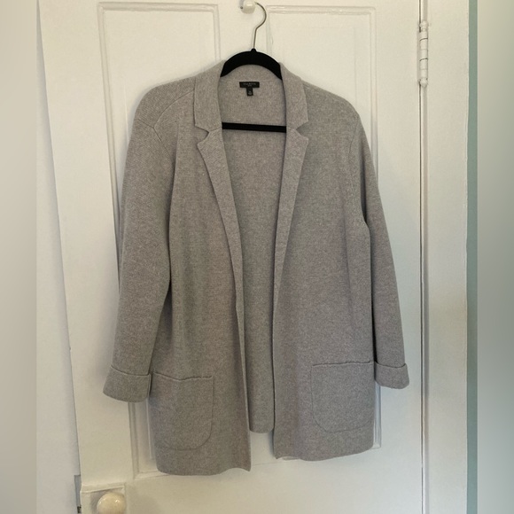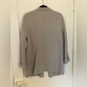 Sweater material, but worn more as a business jacket. So new, basting is still in pockets. Lovely grey color that can go from the office, to dinner or a game! Very versatile addition to your closet!