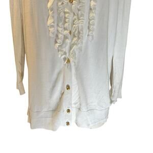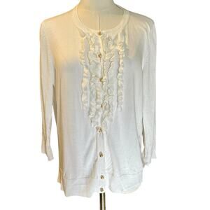 Talbots Sweater Knit Cardigan SZ LG Petite White Ruffles Gold Buttons Feminine