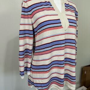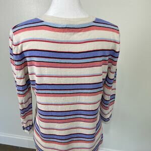 Talbots lightweight Women's sweater- colorful strip pattern with a flattering split neckline, 3/34 length sleeves, straight hem with slits. 55% Linen / 45% Viscose