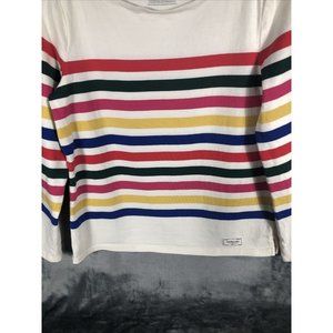 This Talbots sweater is a must-have for any fashion-forward woman. The multicolor striped pattern and dolman sleeves add a stylish touch to its relaxed fit. It's perfect for travel, casual outings, workwear, and business meetings.