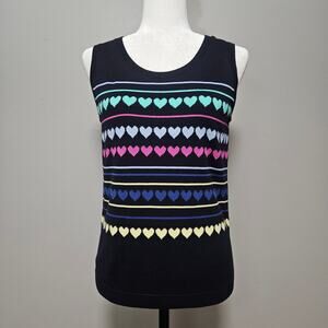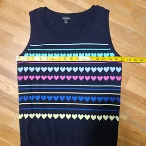 Talbots women's 2-piece sweater set in excellent pre-owned condition. Includes a colorful heart-print button front cardigan (petite medium) and coordinating navy tank top (regular small). Soft knit cotton-rayon blend offers comfort and stretch. Perfect layered or worn separately.