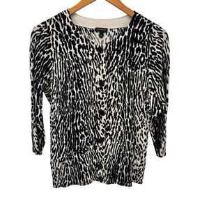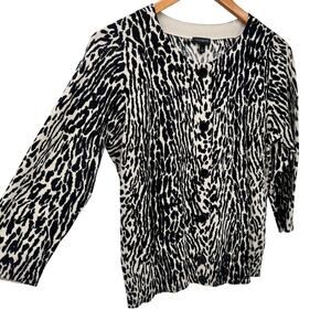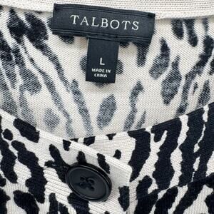 Talbots Sweater Womens Large Cardigan 3/4 Sleeve Button Up Knit Black Vream Leopard Cheetah Animal Print COMFY
