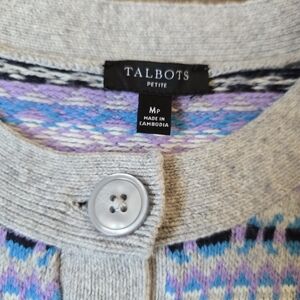 tags: Talbots, Cardigan, Sweater, Fair Isle, Knit, Crewneck, Button Front, Long Sleeve, Women's, Purple, Blue, Gray, Black, Patterned, Cozy, Classic, Preppy, Winter, Fall