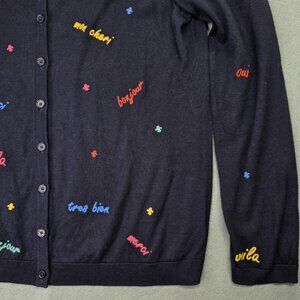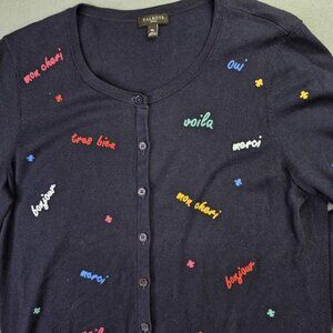 Talbots Sweater Womens Medium Petite Navy Blue French Words Embroidered Cardigan