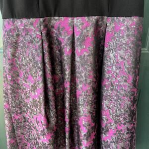 Gorgeous Talbots dress with a black ponte stretch knit bodice that has a zip close and v-neckline. The skirt portion of the dress is a rich taffeta brocade with an abstract gray and purple print--just beautiful!