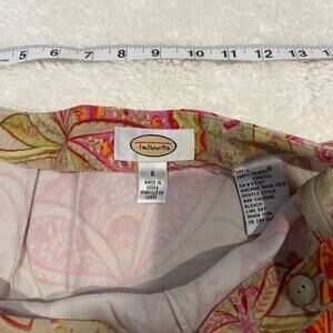 This Talbots skirt in size 8 features a vibrant orange and pink floral pattern, making it perfect for various occasions such as parties, casual outings, or business meetings. The long A-line skirt with a side zipper closure is made of 100% Lyocell, a comfortable and easy-to-care-for material that is machine washable. The skirt's high rise and bohemian theme with accents of flowers, Barbie, and daisies adds a touch of charm to your summer, fall, or spring wardrobe.