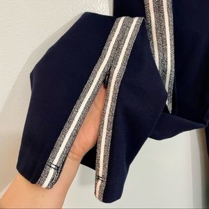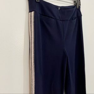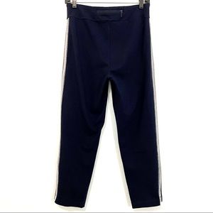 Gray and white knitted stripes running down side of legs, two front waist pocket and one zipped small pocket on the back waistband, ankle zippers at the bottom of the legs.