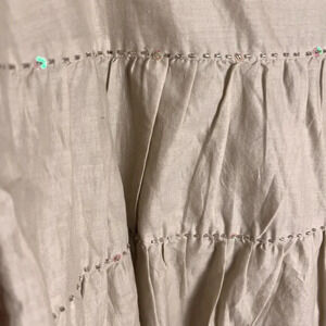 Add a touch of elegance to your wardrobe with this beautiful Talbots A-line skirt in tan. The beaded design adds sparkle and sophistication to the piece, making it perfect for any occasion, from travel to weddings, parties, cocktails, or even for workwear or business settings. The skirt is made of cotton and is machine washable, making it easy to care for.