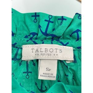 Talbots Tank Top Women Small Petite Green Blue Anchor Ruffle Neck Button Up