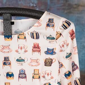 Talbots Tea Party Theme Blouse Women's SMALL Colorful Satin Cups Chairs England