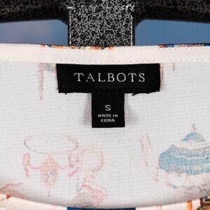 Pre-Owned: Talbots Tea Party Theme Blouse Women's SMALL; Colorful; Satin: 100% Polyester (Fabric Tag has been removed--Material information taken from a similar listing). This item is in excellent, pre-owned condition with no rips, holes, or stains. Measurements: