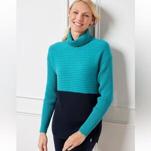 Talbots Teal Blue Navy Colorblock Ribbed Turtleneck Sweater Women’s Size Small