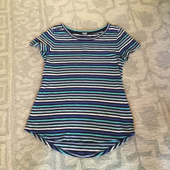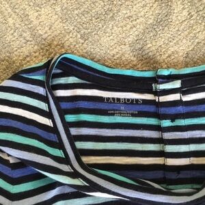 Talbots tee with back button detail. Stripes of blues, aqua, black and white. Size M. 60% cottage, 40% modal. Excellent condition.
