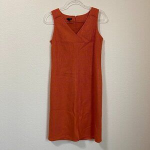 Talbots textured orange v neck sleeveless sheath dress lined. Hand pockets. Back zipper. Front slit for movement. Cotton blend