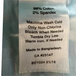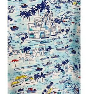 Light blue and white with a vacation destination print! Palm Trees, boats, Umbrellas, buildings, luggage! Very cute!! Plain Front, 2 front and back pockets. Super comfy and soft! 98% Cotton, 2% Spandex. Looks like they run a bit large.