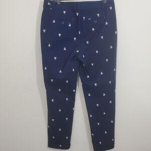 This is a pair of pants from Talbots in The Weekend Chino style. Navy blue with embroidered sail boats all over. Zip / button closure. Has pockets.