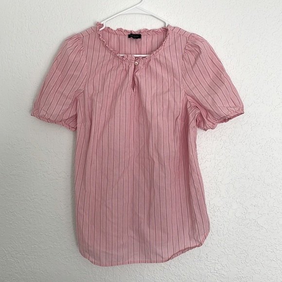 Spring 2022 collection. Pink and white striped. Cotton. Ruffle trim around neckline and on shoulders. Button closer at neck and arms. Excellent condition.