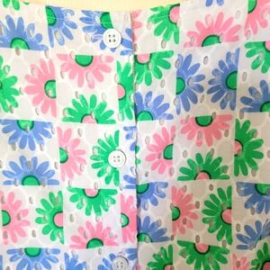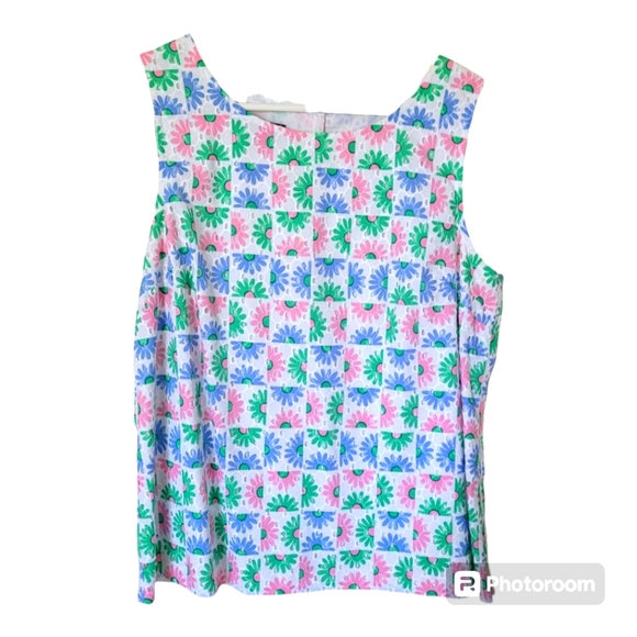 Sleeveless Talbots Top with flowered pattern on a white background, buttons up the back, size PL