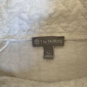 T by Talbots Turtleneck style top in ivory with silver threads, running through it. Side zips on each side and cable pattern.