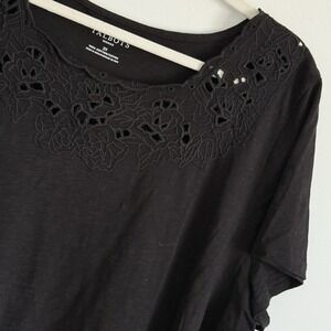 The Talbots Lace Trimmed Top in size 2X is a stylish and comfortable option for women who love casual wear. Made from 100% cotton with a lace fabric type, this black top features a round neckline, short sleeves, and a pullover closure. Perfect for travel, parties, or casual outings, this lightweight top is ideal for summer, fall, or spring seasons. The lace accents add a touch of femininity to the basic style, making it a versatile and trendy addition to any wardrobe.