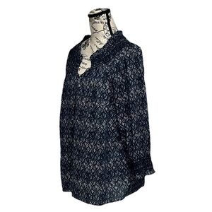 Talbots Top Womens L Blue Geometric Print Smocked Neck Cotton Boho Boho Peasent