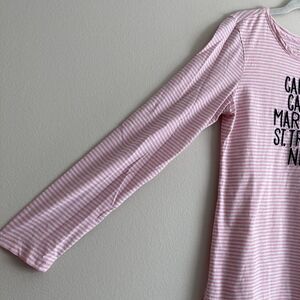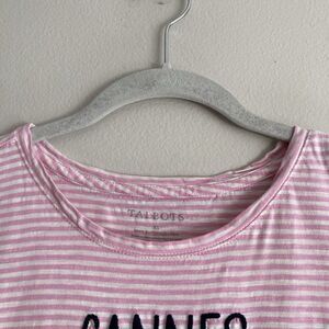 Talbots Top Womens XS Pink Striped Embroidered Destination Embroidered France. Talbots womens shirt. Round neck. Long sleeves. 100% cotton. Pink and white striped with embroidered navy blue French city names. Size XS. Measured laying flat: 17.75 inches from pit to pit, 22.25 inches long from top to hem.