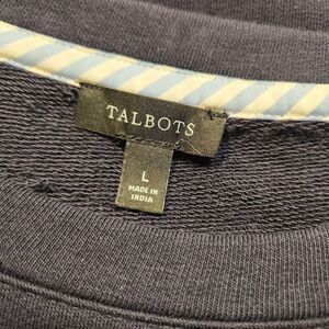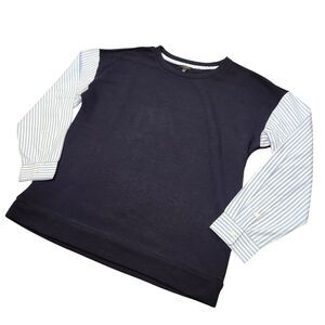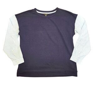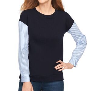 Talbots Top Woven Sleeve Crew Neck Navy Blue Striped Long Sleeve Pullover