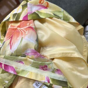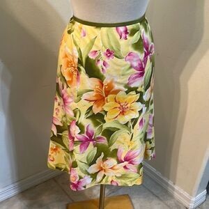 Gorgeous! This silk blend skirt can be worn for many occasions. It is made very well and lined. It zips up the side and has a great fit. The pattern is so pretty and it has a green ribbon trim around the waist. Just beautiful and in excellent condition!