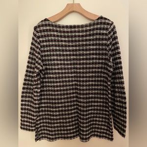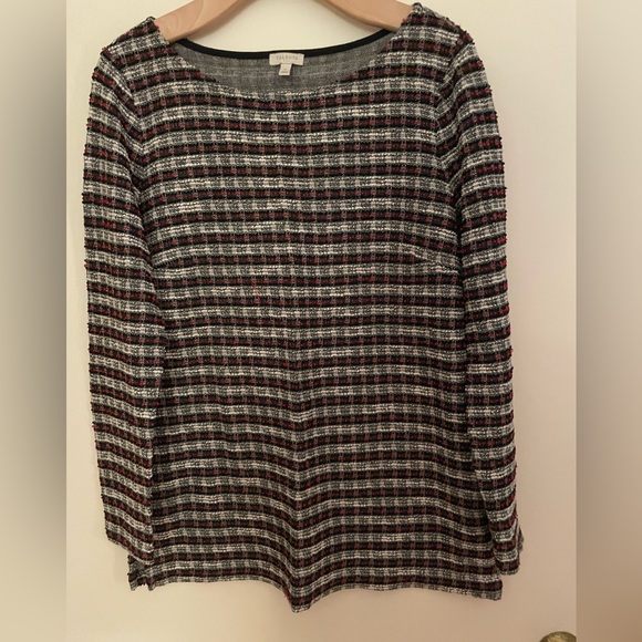 Talbots long sleeve red/black/white tunic, 3.5” side slits, cotton/polyester, size M, shoulder to hem 27”