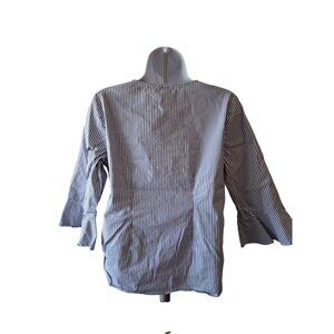 Elevate your wardrobe with this chic Talbots Petites blouse featuring timeless stripes and a flattering ruffle-detailed V-neckline. Its breathable cotton blend ensures comfort and style for versatile wear.