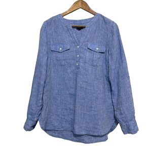 Talbots Womens 100% Linen Roll Tab Sleeve Popover Top Blue