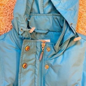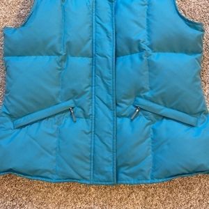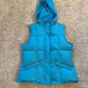 Puffer vest with hide-a-way adjustable hood. Double zipper and snaps. Slit pockets. Glass zipper pulls. 20” pit to pit. 23” Long. EUC. Scarf sold separately.