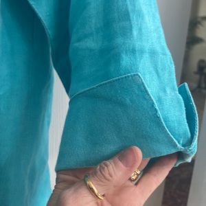 Vibrant turquoise blouse. Button-up front. Collared neckline. Three-quarter sleeves. No flaws, but visible wear and tear. Dog friendly home.