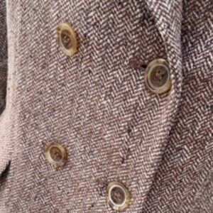 Brown, Tan, Cream with a touch of Gray, Double Breasted Wool Blend Tweed in a Herringbone Pattern. Pea Coat style waistcoat with brown buttons, lay back collar with peaked lapels. Formal or Casual Classic Suit Blazer Jacket. Fitted, Waist Length, Flattering Silhouette.