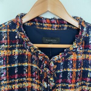 Talbots Tweed Jacket Blazer 10 Sunflower Plaid Navy Multi Preppy Old Money $199 Brand new with tags. Measurements In Photos! Polished with feminine details. Our elegant tweed jacket in a smile-worthy sunflower plaid pattern. Detailed with chic patch front pockets. Long Sleeve Hits Above Hip Hook & eye closure Patch front pockets Imported