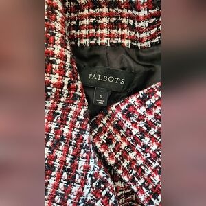 Talbots red, black and white black tweed lined moto jacket. The jacket features jetted styled pockets and small plackets, slits at the sleeve hem. A very versatile piece to add to your wardrobe.