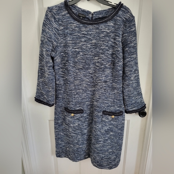 This Talbots Tweed Shift Dress is a sophisticated knee-length dress in a marled tweed fabric with 3/4 sleeves and a scoop neckline. It features gold buttons on the front, adding a touch of elegance, and convenient pockets for practicality. The dress has a zipper closure and is designed for women's size 12. Made from a cotton blend material, this classic shift dress is suitable for various occasions including travel, casual outings, workwear, and business settings, making it a versatile and stylish choice for any season.